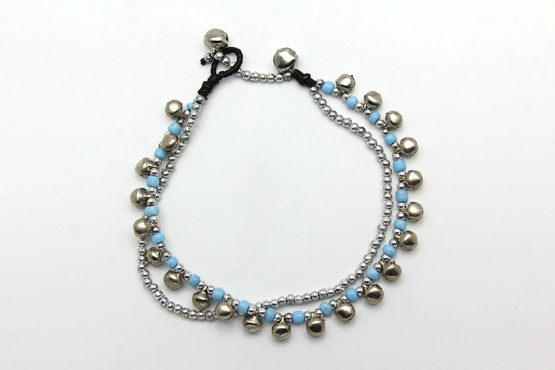 Hand Made Fair Trade Anklet Double Strand Silver Beads Blue