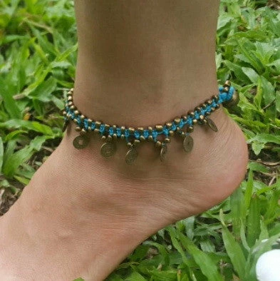 Hand Made Fair Trade Anklet Double Strand Brass Coins Turquoise