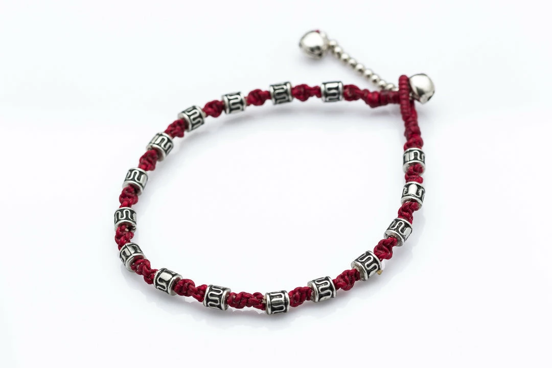 Hand Made Fair Trade Anklet Waxed Cotton Silver Beads Maroon