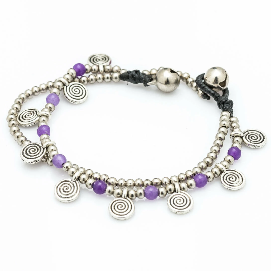 Fair Trade Thai Hill Tribe Silver Bead And Charm Bracelet Double Purple Swirl
