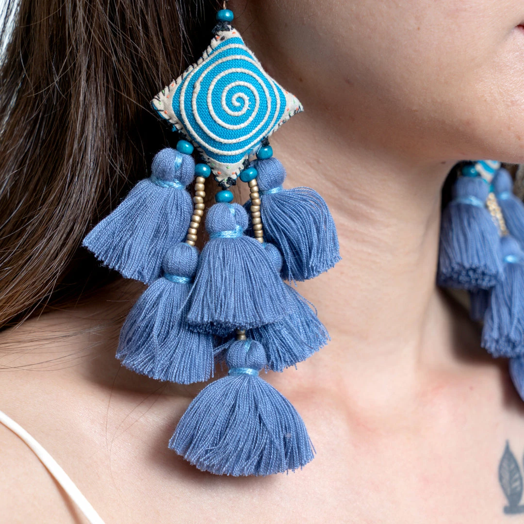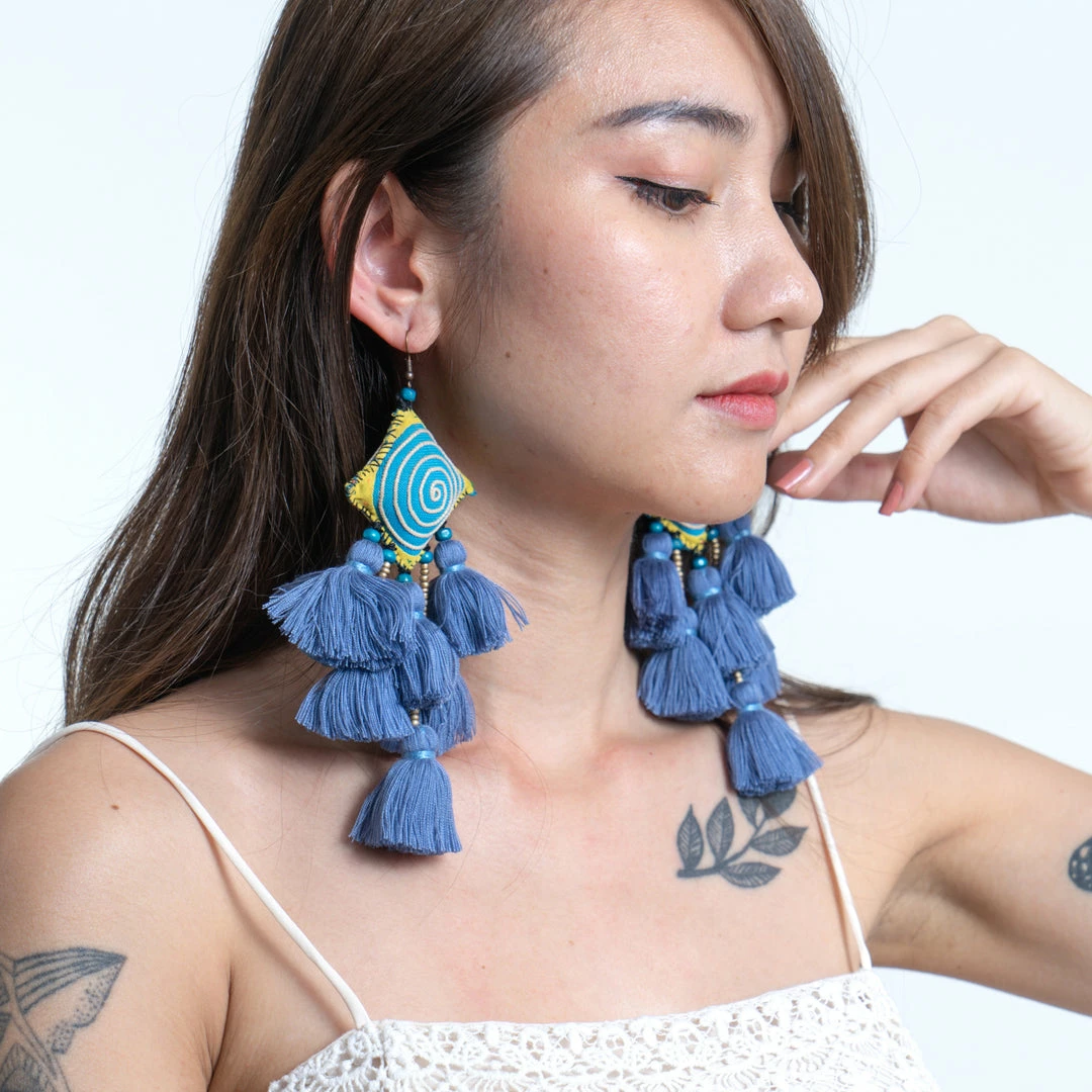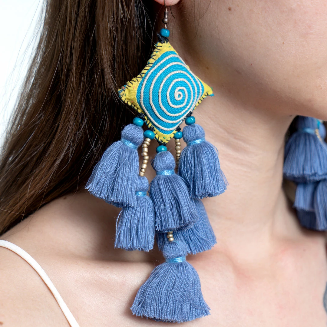 Lovely boho handmade wired hill tribe pillow dangle earrings with tassels and beads.