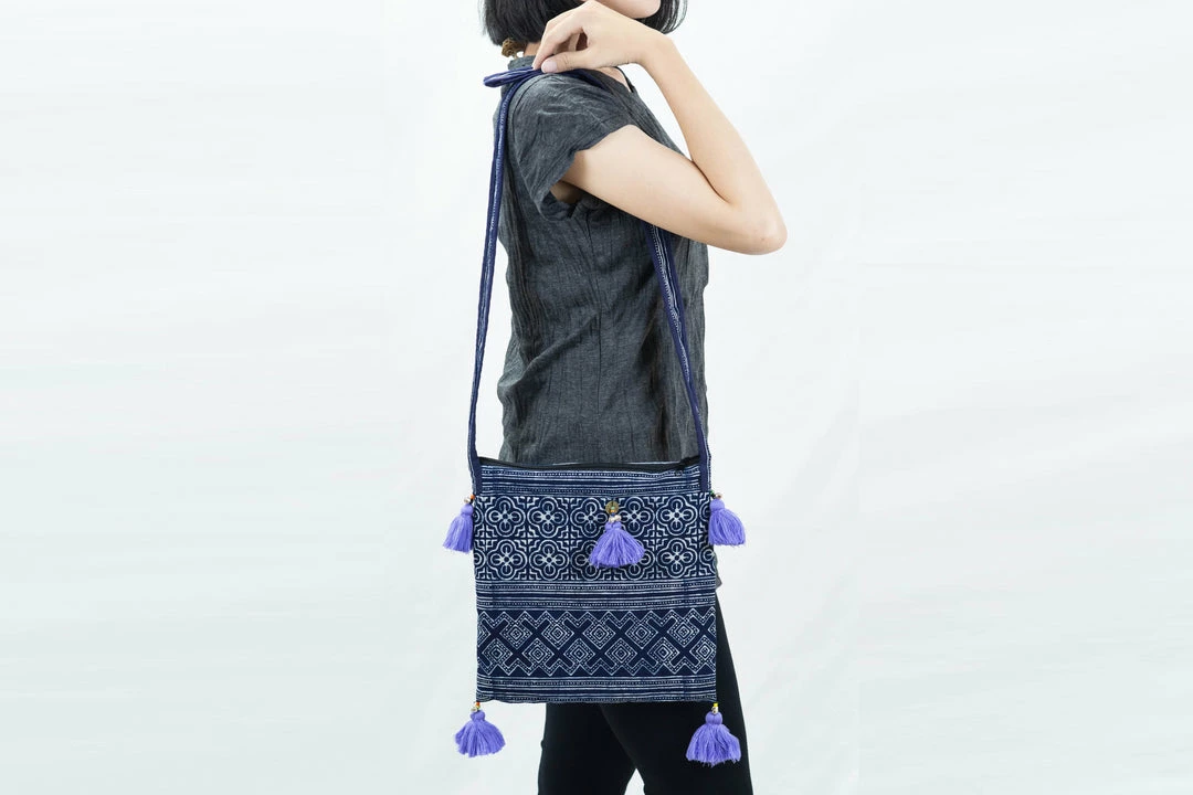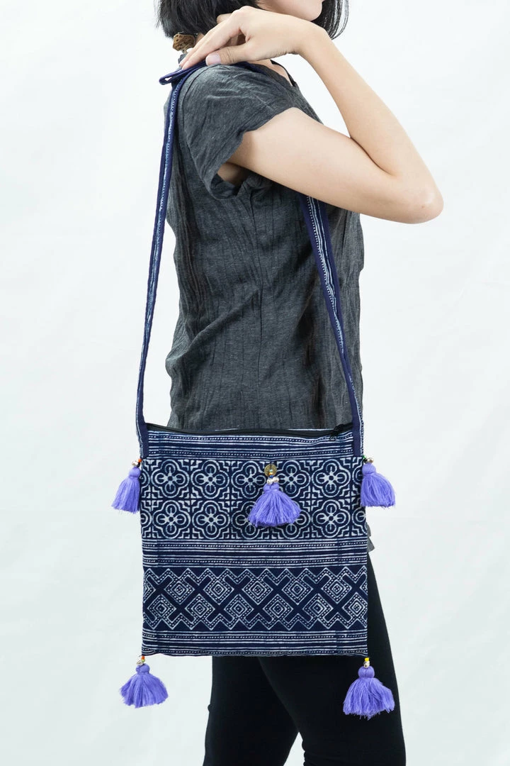 Hmong Hill Tribe Indigo Batik Crossbody Sling Bag. Adorn with beautiful color tassels and made with Hmong traditional indigo batik with intricate geometric patterns