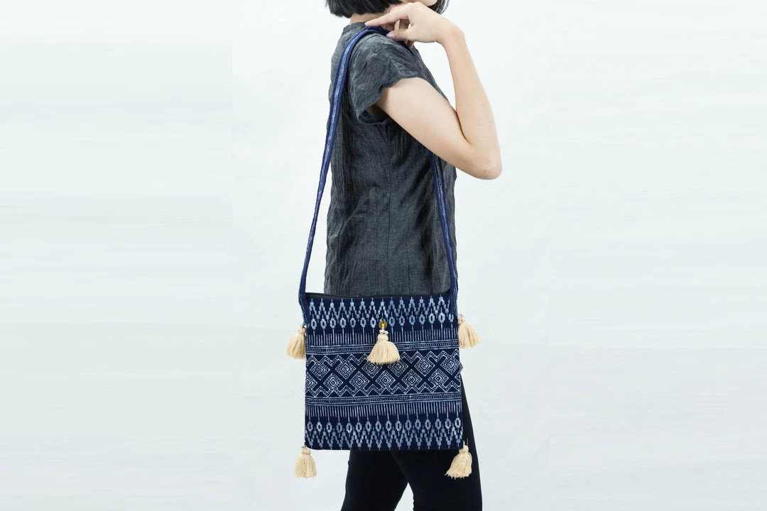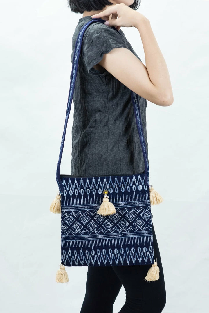 Hmong Hill Tribe Indigo Batik Crossbody Sling Bag. Adorn with beautiful color tassels and made with Hmong traditional indigo batik with intricate geometric patterns