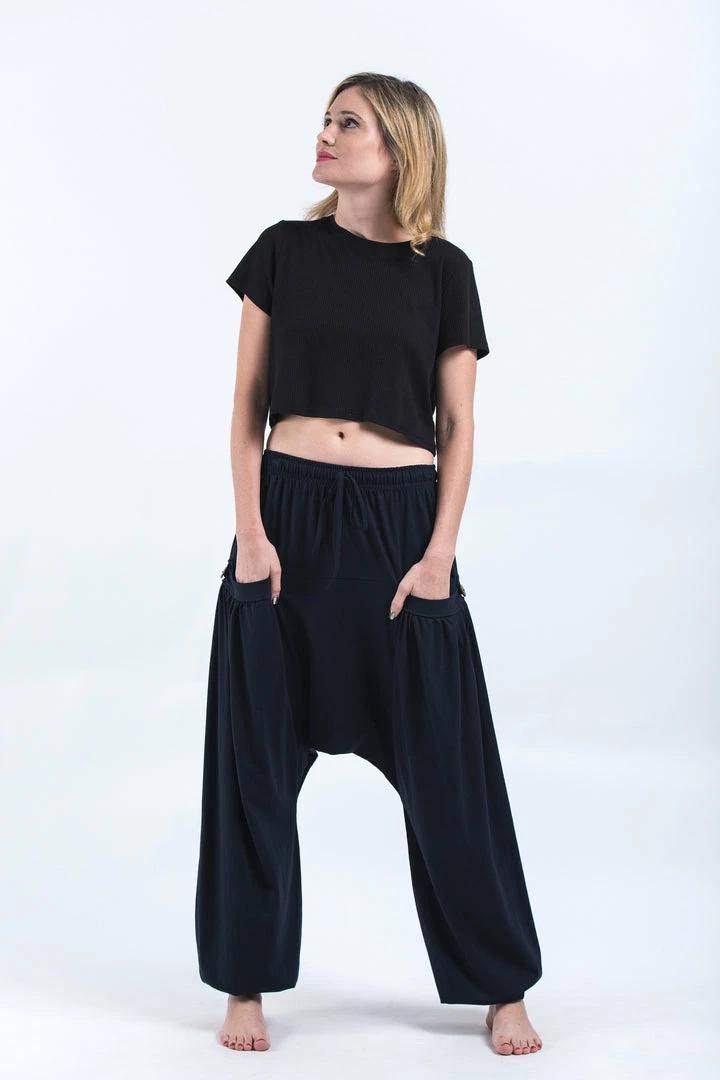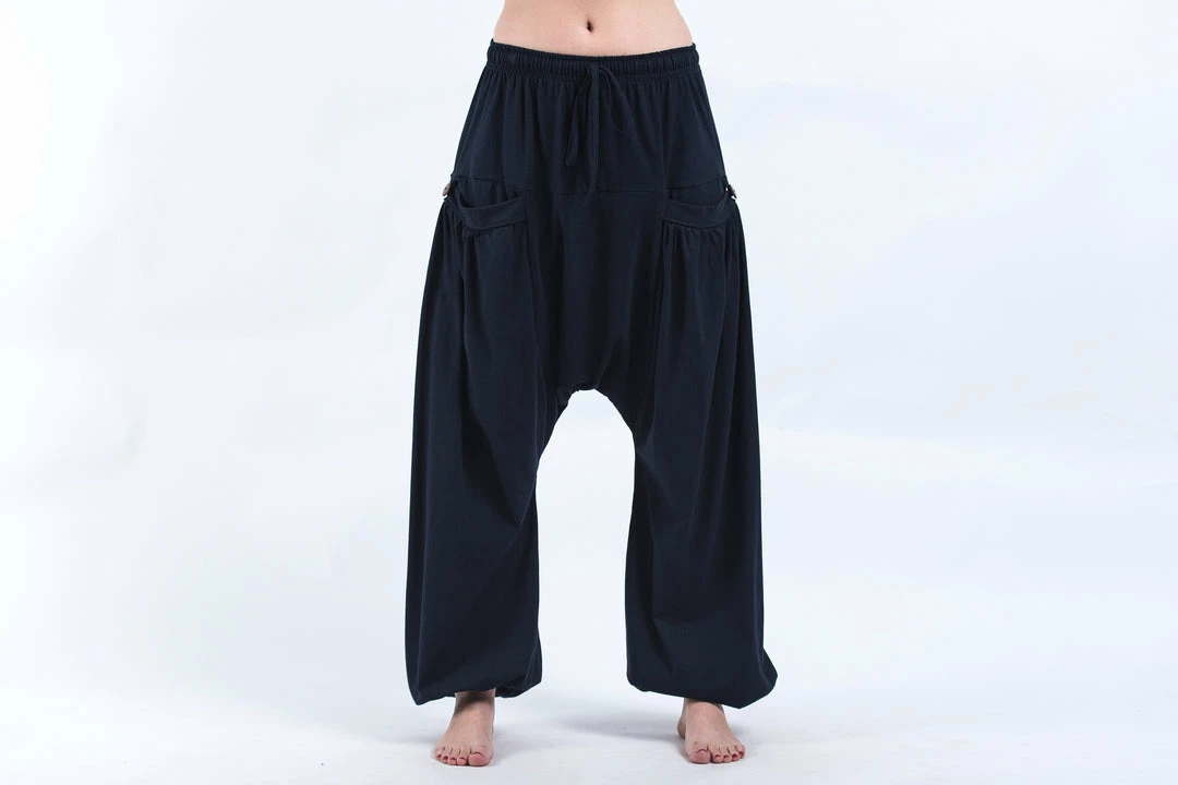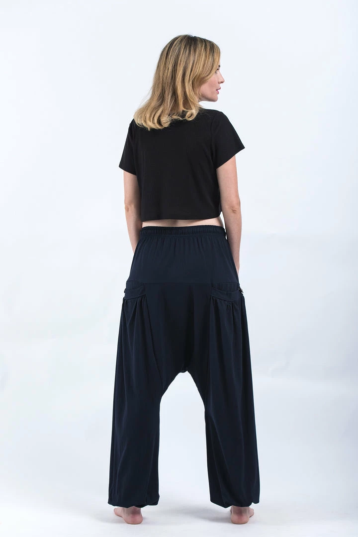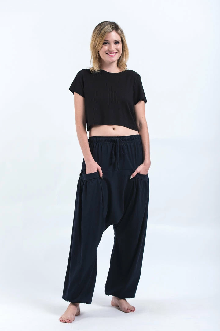 Loose-fit knitted cotton harem pants featuring elastic waist and ankle cuffs.