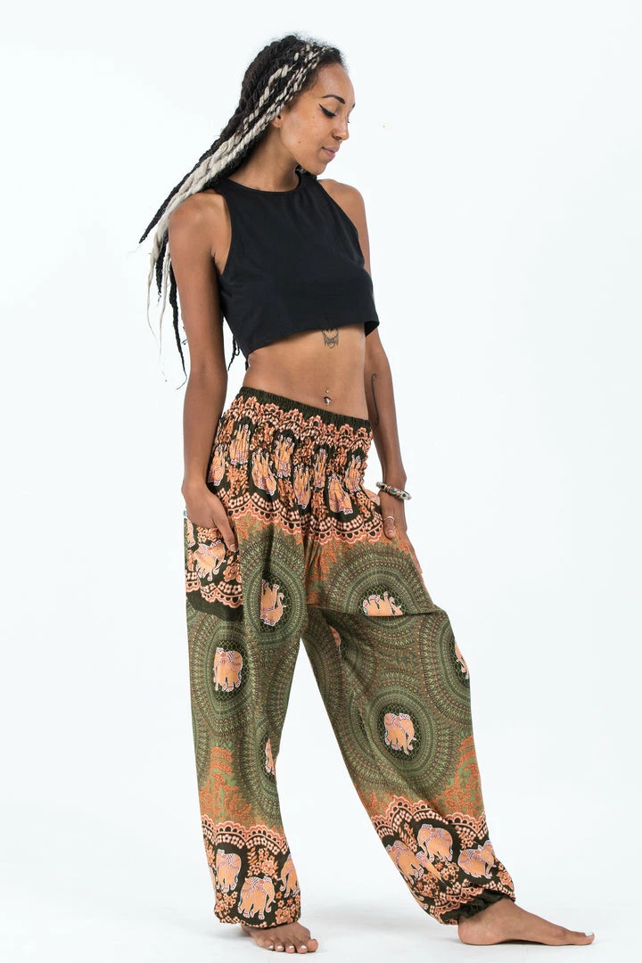 All these high cut gender neutral Elephant Pants have comfy smocked waist and one side-pocket.