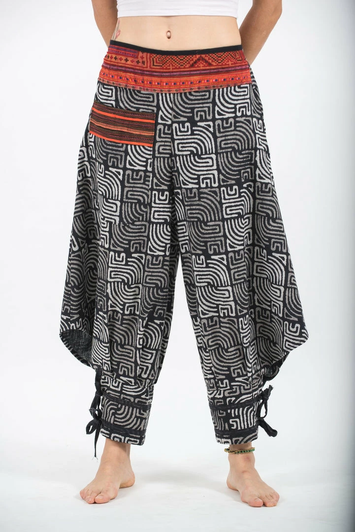 HaremPants.com Maze Prints Thai Hill Tribe Fabric Women’s Harem Pants With Ankle Straps In Black