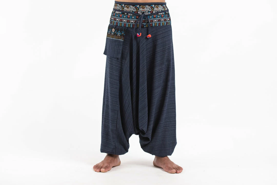 Pinstripe Cotton Low Cut Harem Pants With Elephant Trim and a side pocket.
