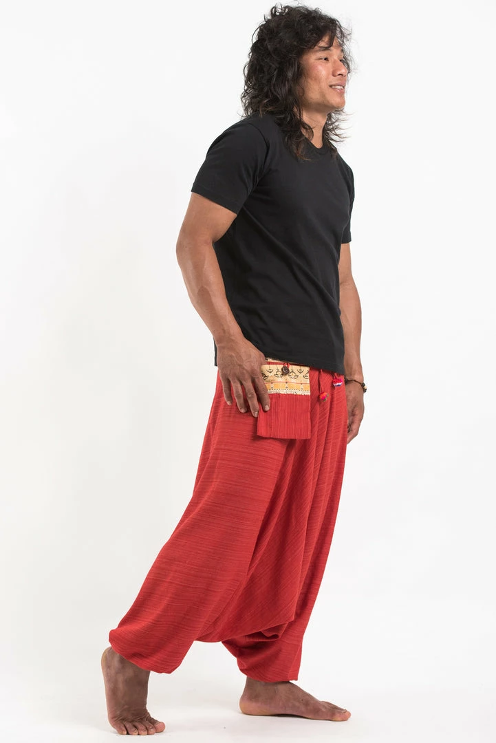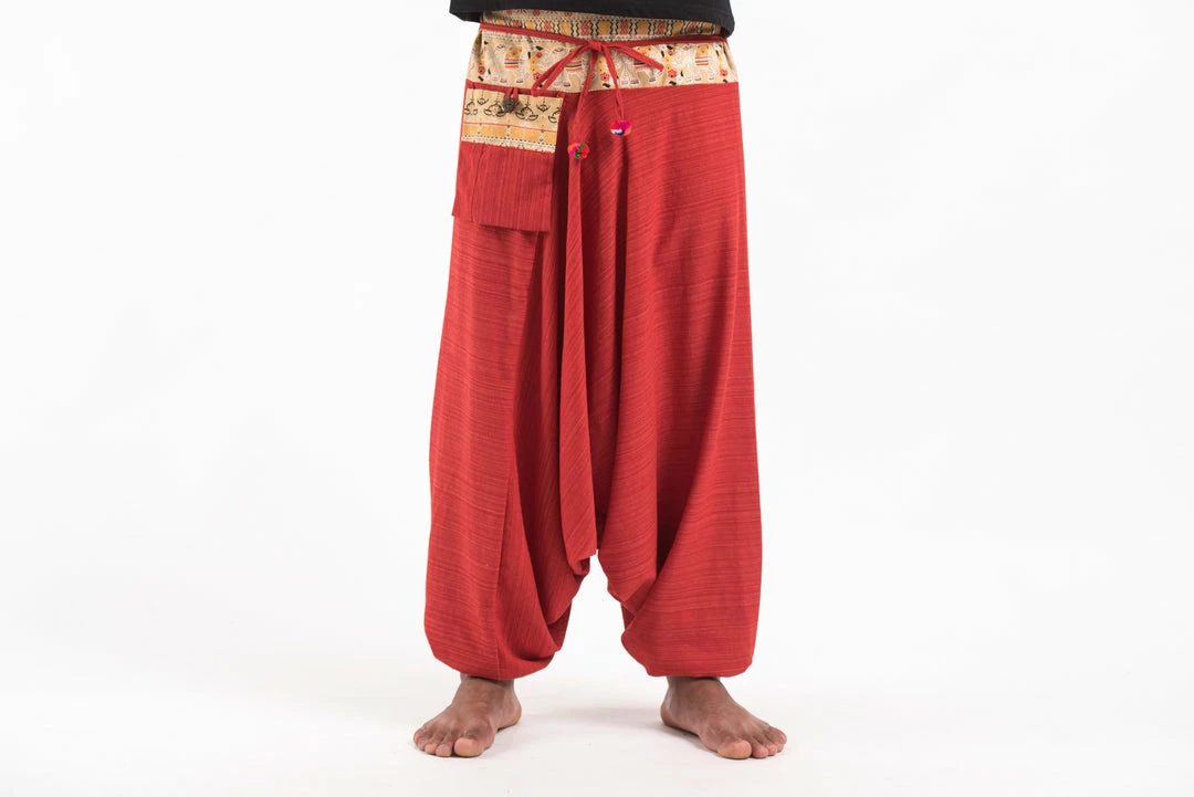 Pinstripe Cotton Low Cut Harem Pants With Elephant Trim and a side pocket.