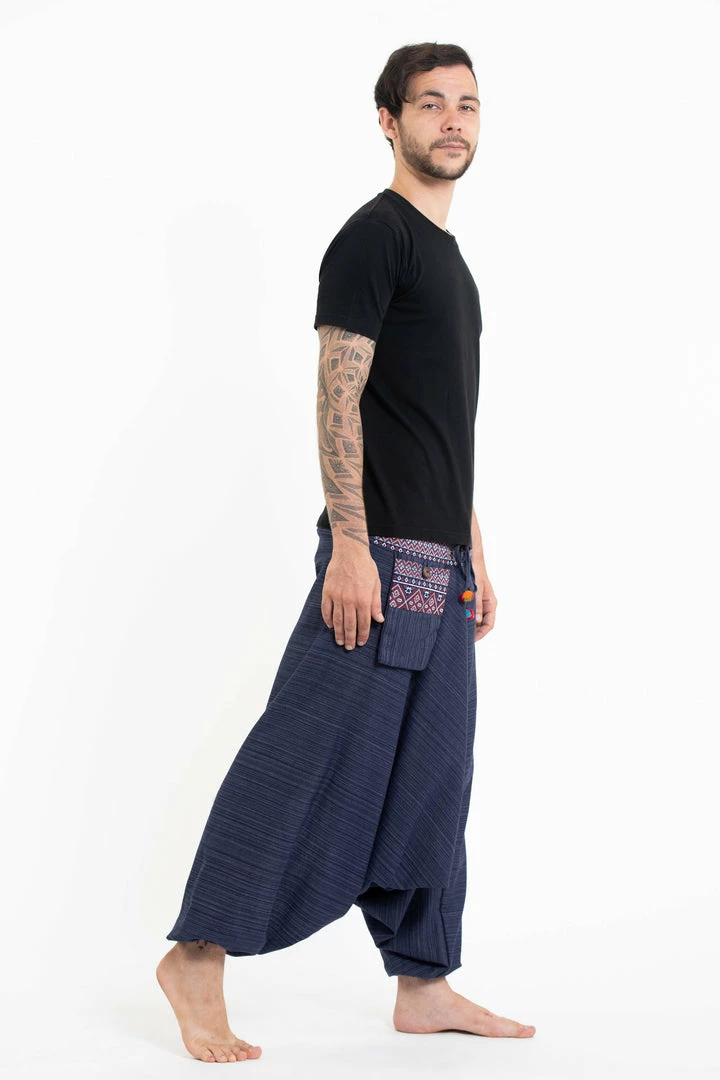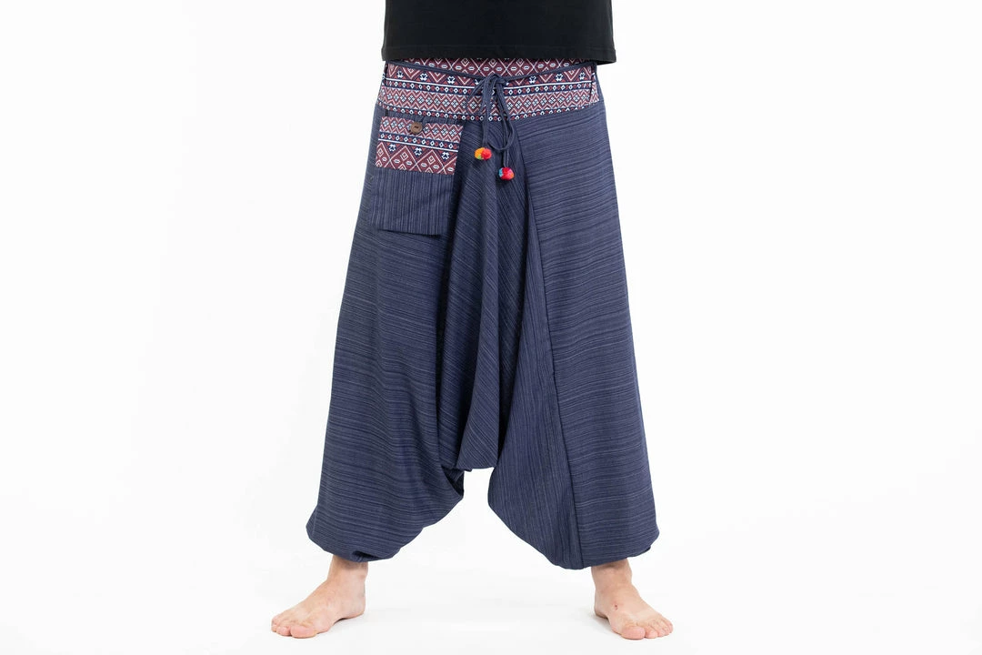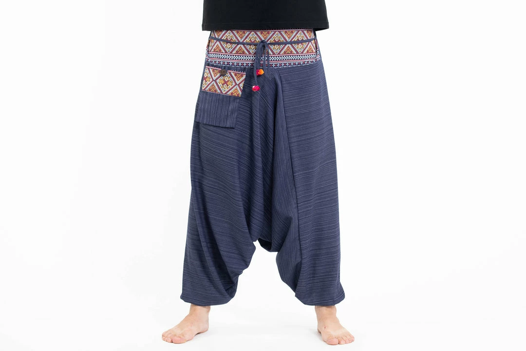 Pinstripe Cotton Low Cut Harem Pants With Hill Tribe Trim and side pocket.