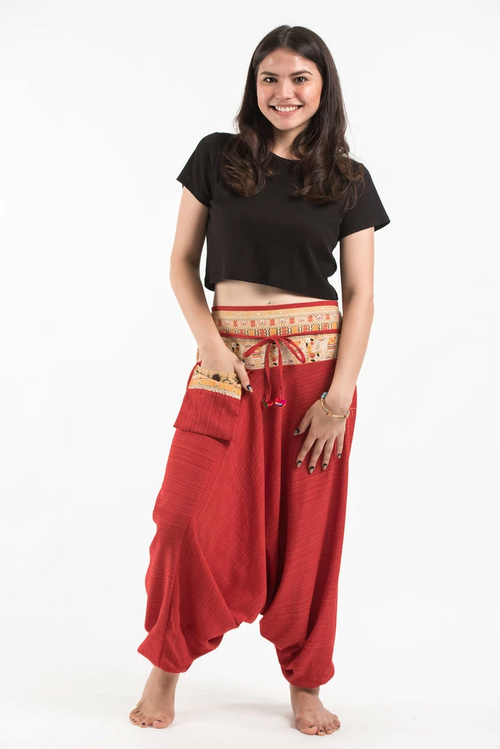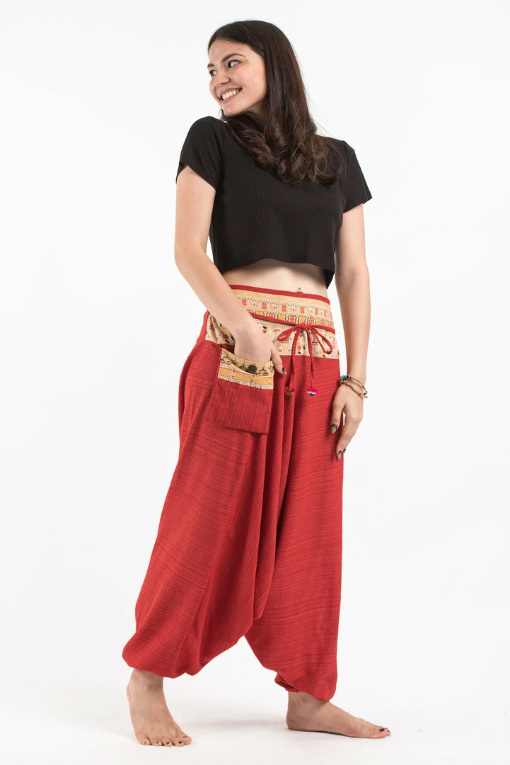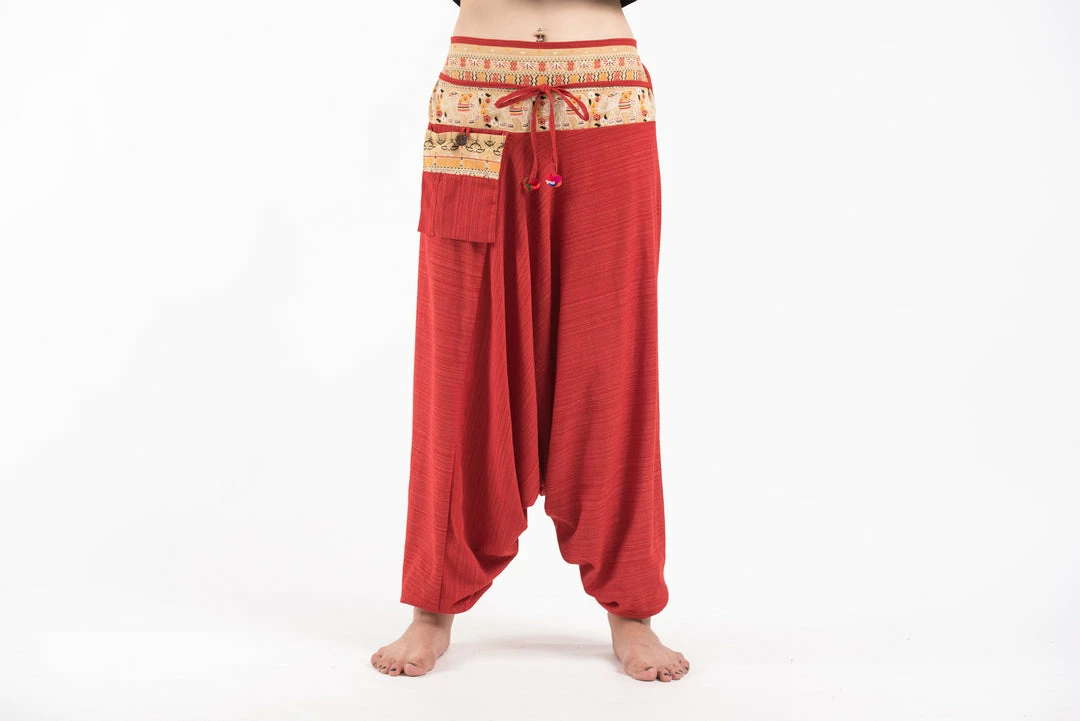Pinstripe Cotton Low Cut Harem Pants With Elephant Trim and a side pocket.