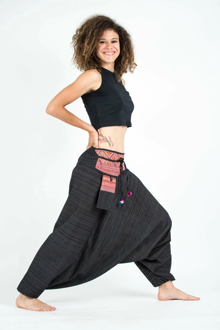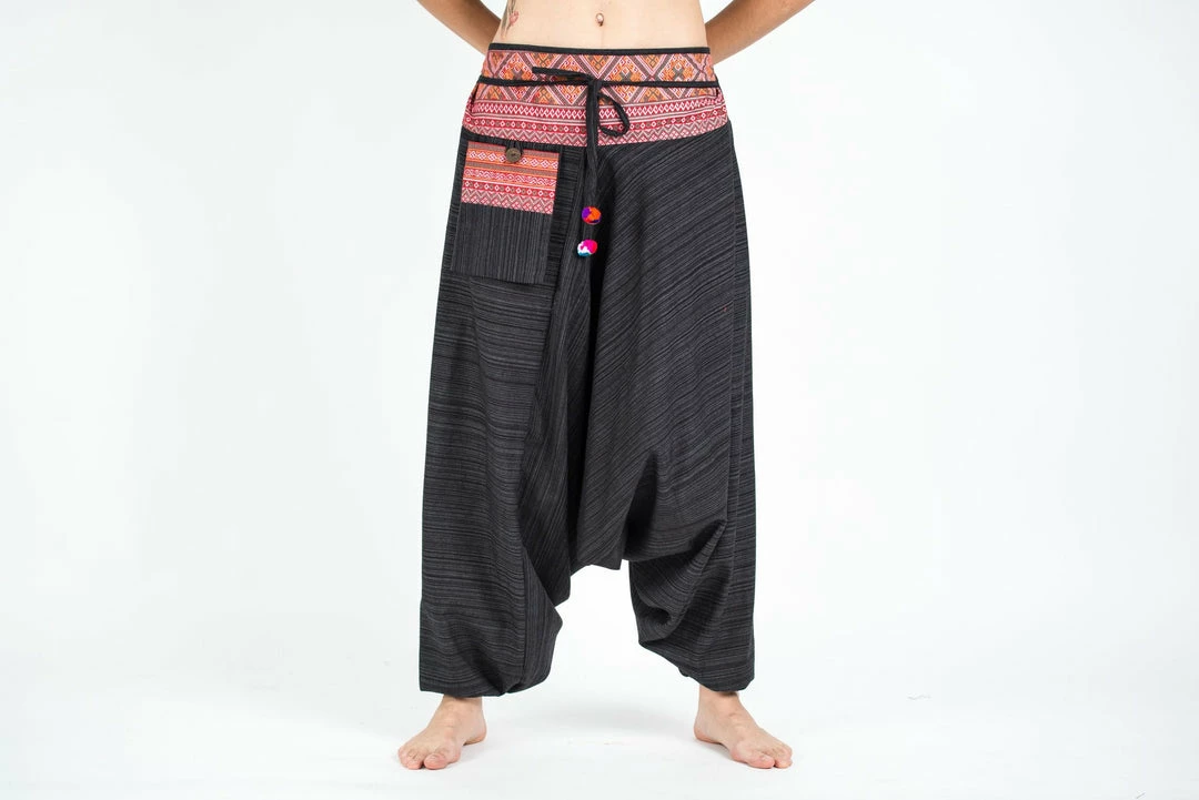 Pinstripe Cotton Low Cut Harem Pants With Hill Tribe Trim and side pocket.