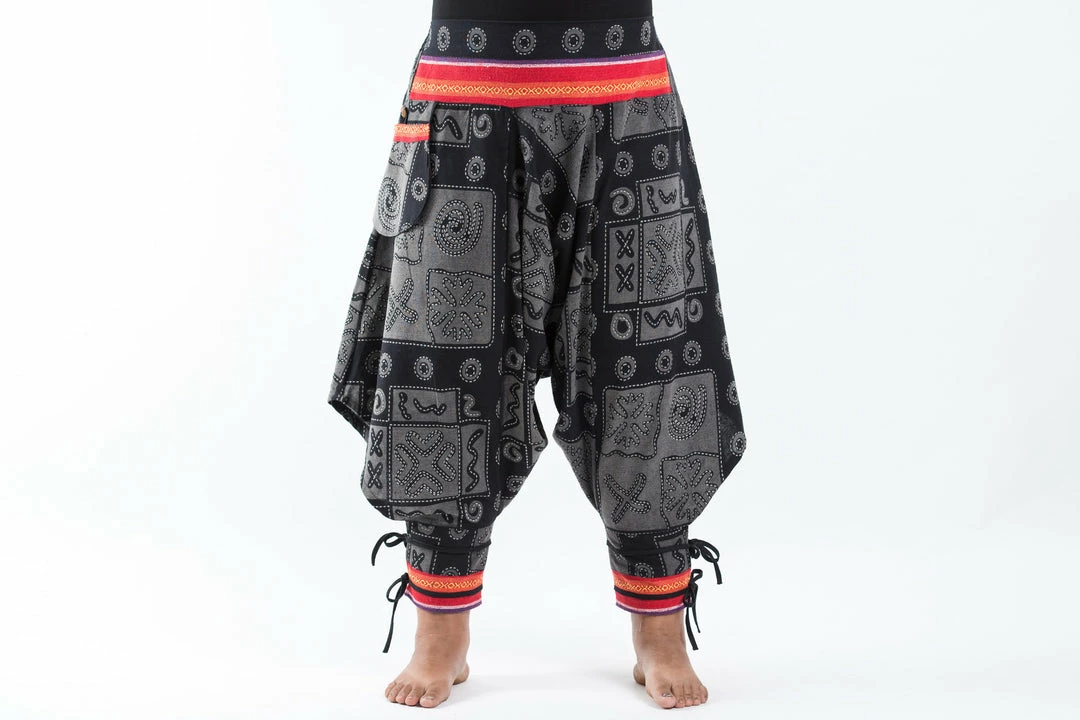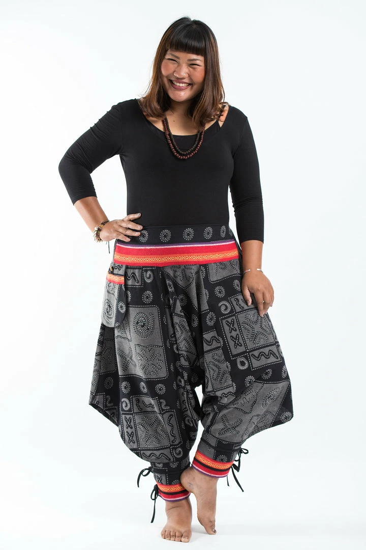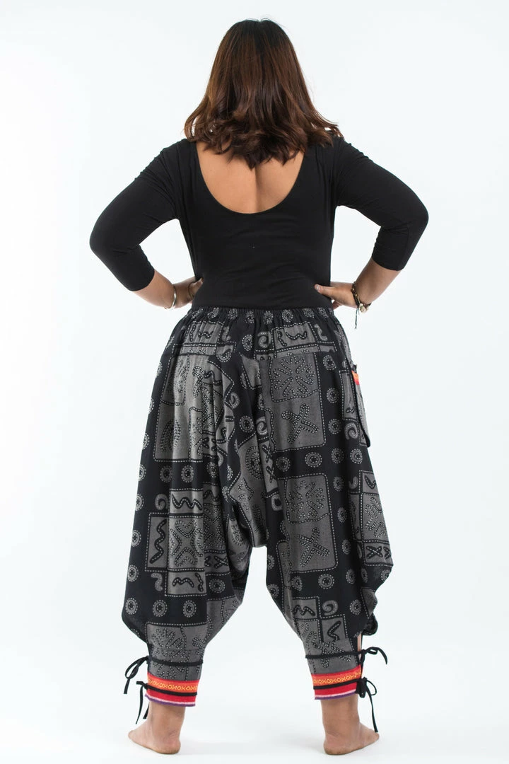 HaremPants.com Plus Size Black And Gray Thai Hill Tribe Fabric Women Harem Pants With Ankle Straps