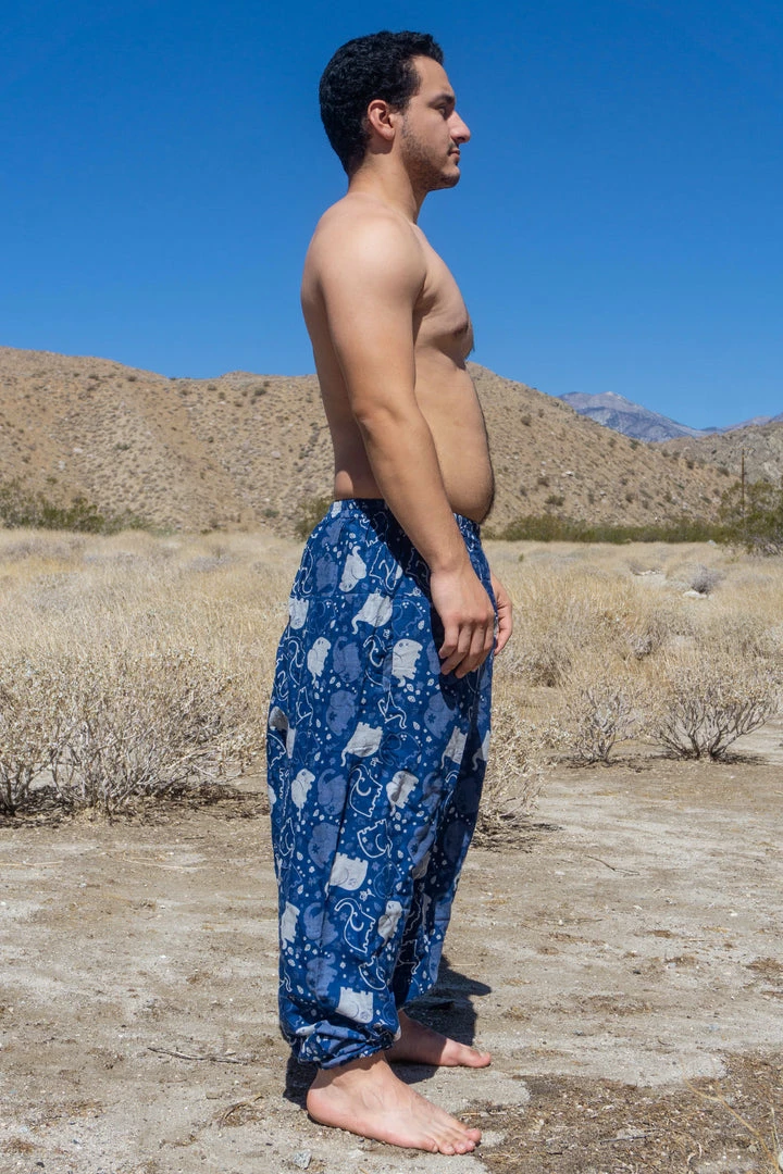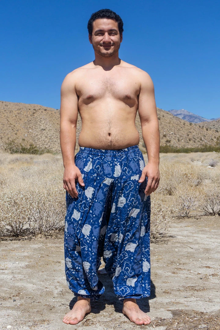 HaremPants.com Plus Size Elephant Prints Men’s Low Cut Cotton Harem Pants In Indigo