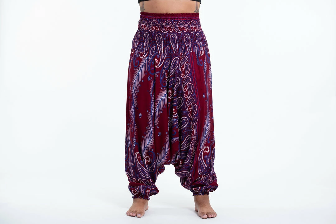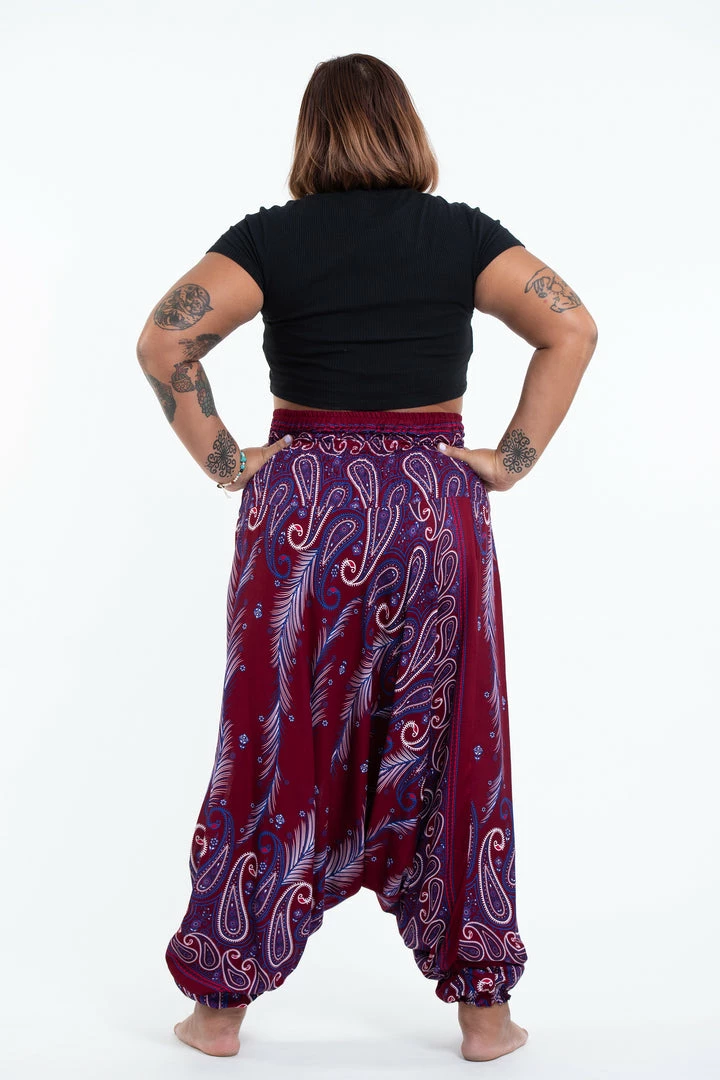 HaremPants.com Plus Size Paisley Feathers Drop Crotch Women’s Harem Pants In Red