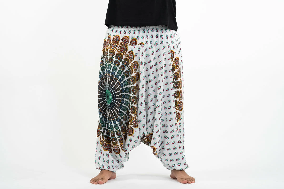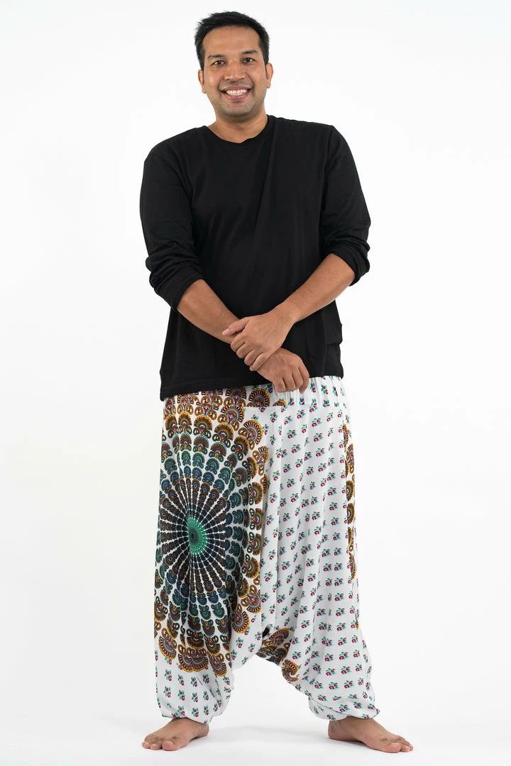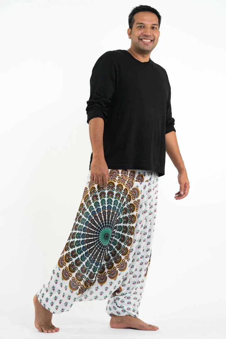 HaremPants.com Plus Size Peacock Mandalas Drop Crotch Men’s Harem Pants In White