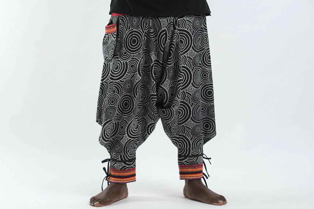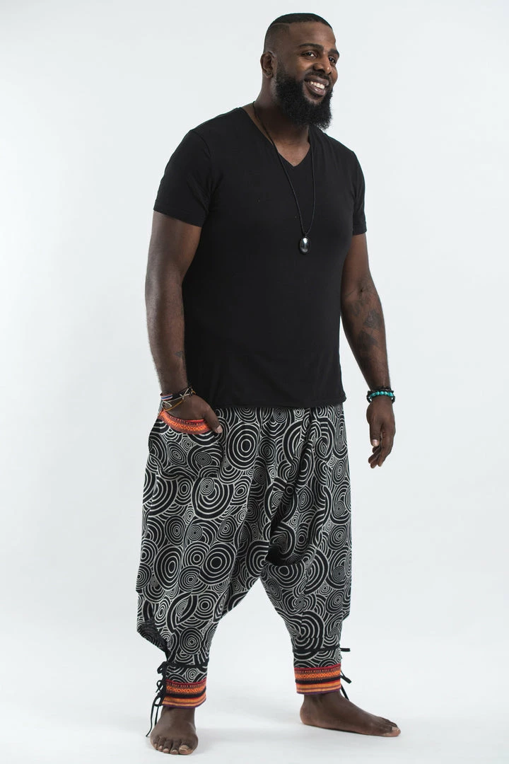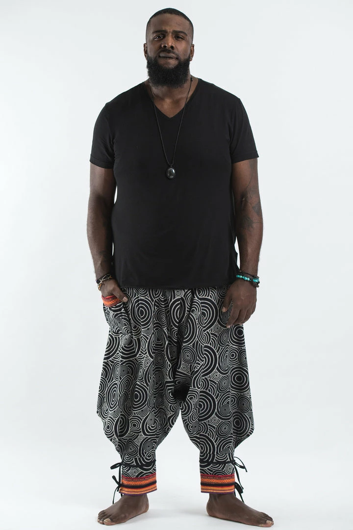 HaremPants.com Plus Size Swirls Prints Thai Hill Tribe Fabric Men Harem Pants With Ankle Straps In Black Men’s
