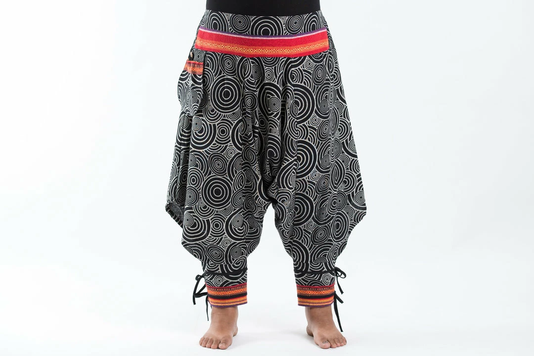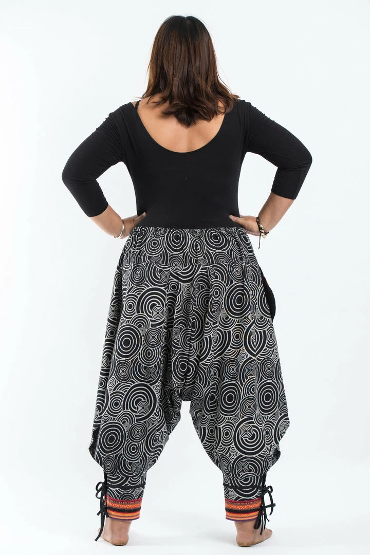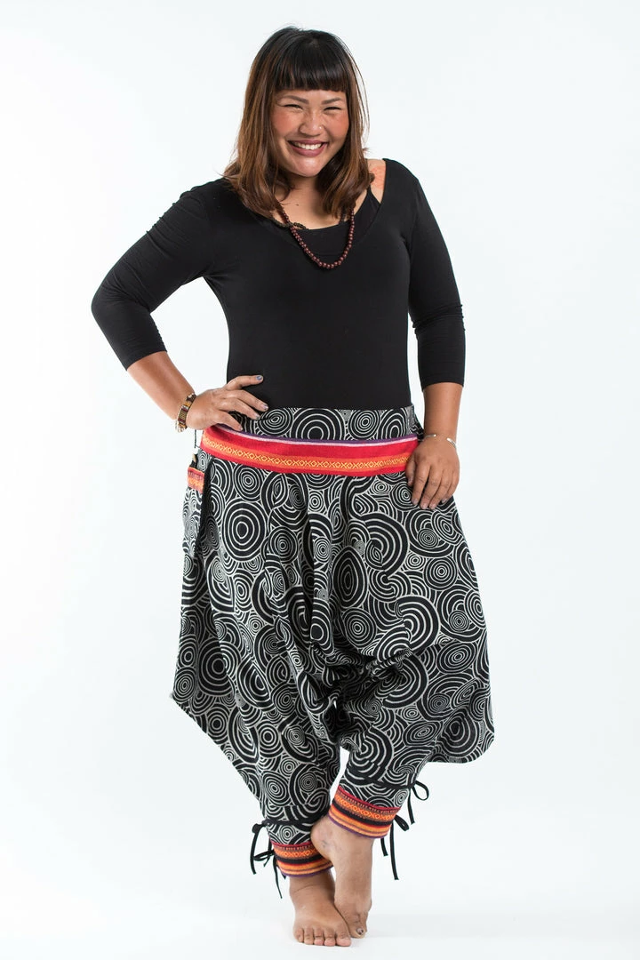 HaremPants.com Plus Size Swirls Prints Thai Hill Tribe Fabric Women Harem Pants With Ankle Straps In Black Women’s