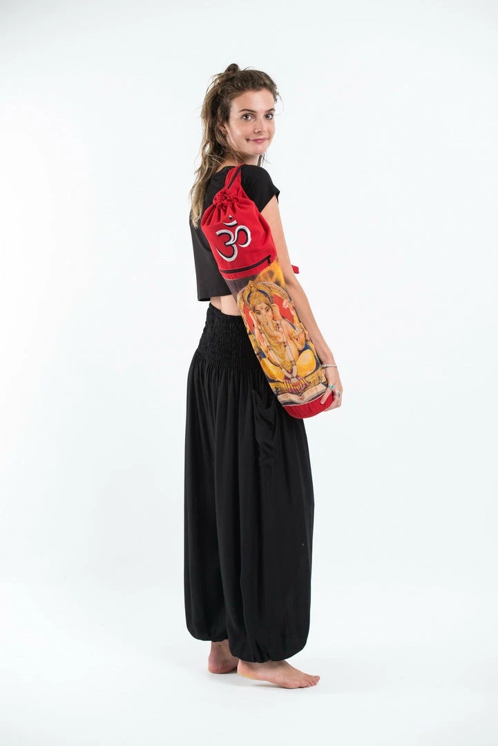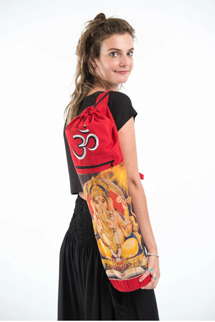 Red Embroidered Ohm + Ganesha Print Cotton & Hemp Yoga Mat Bag