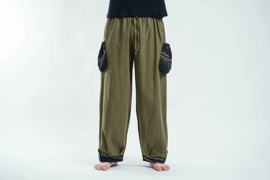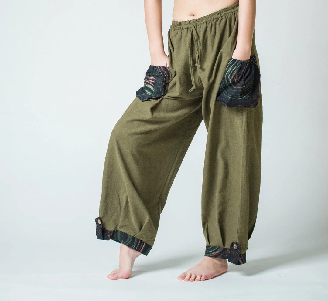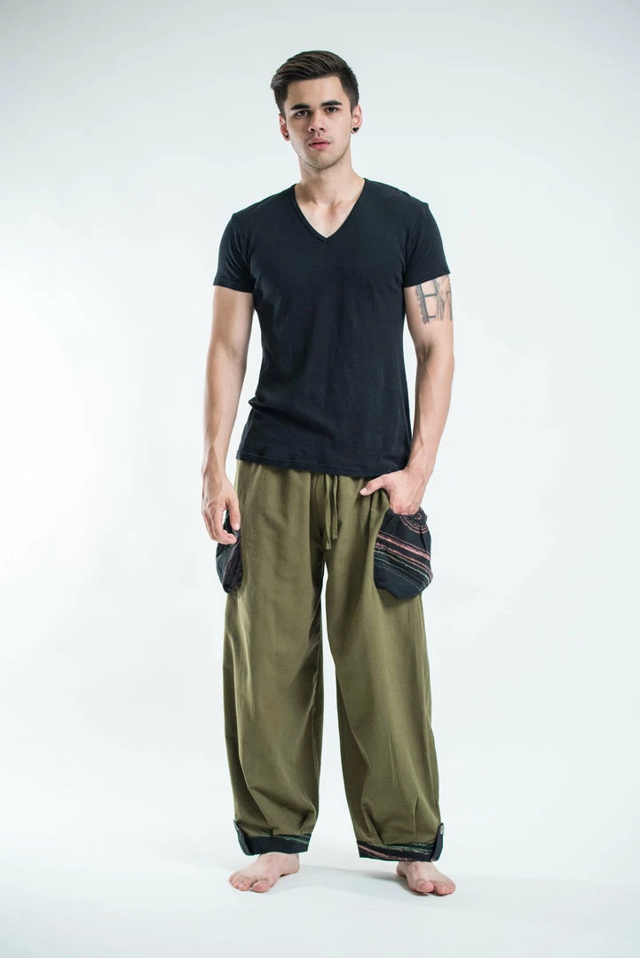 Thai Cotton Drawstring Pants With Hill Tribe Trim Ankles and Pockets