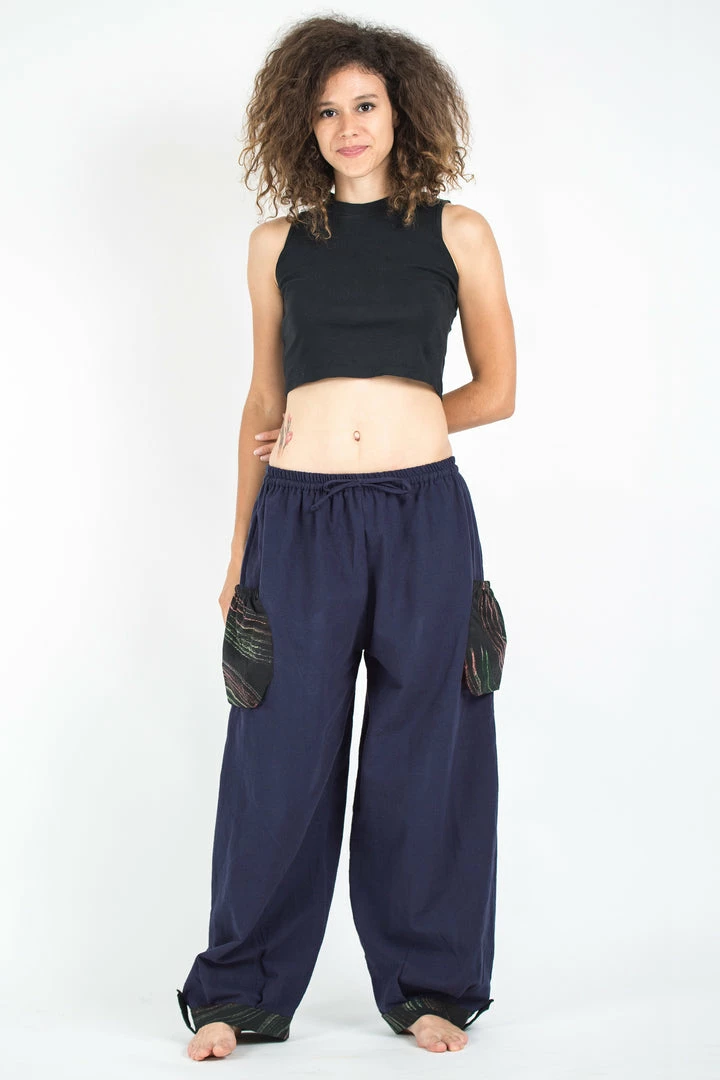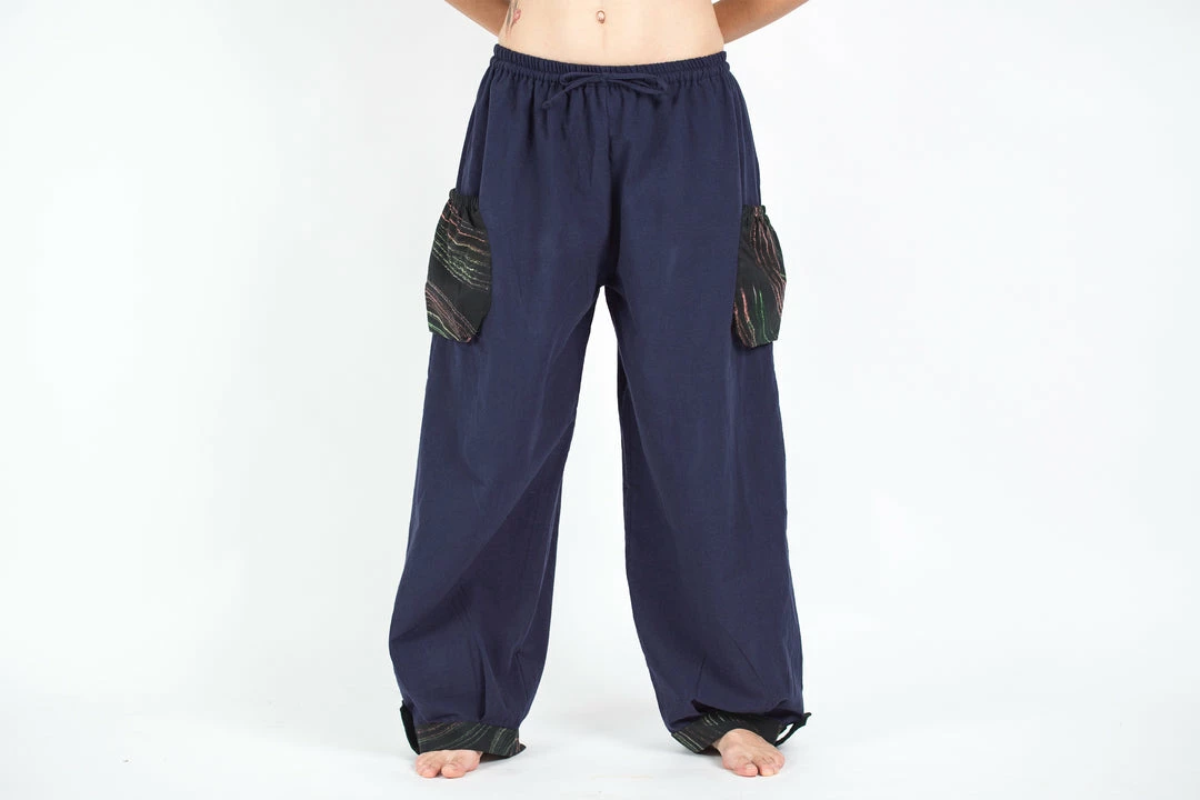 Thai Cotton Drawstring Pants With Hill Tribe Trim Ankles and Pockets.
