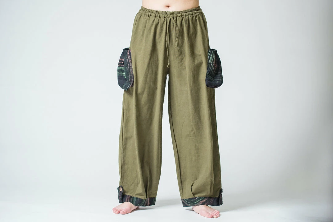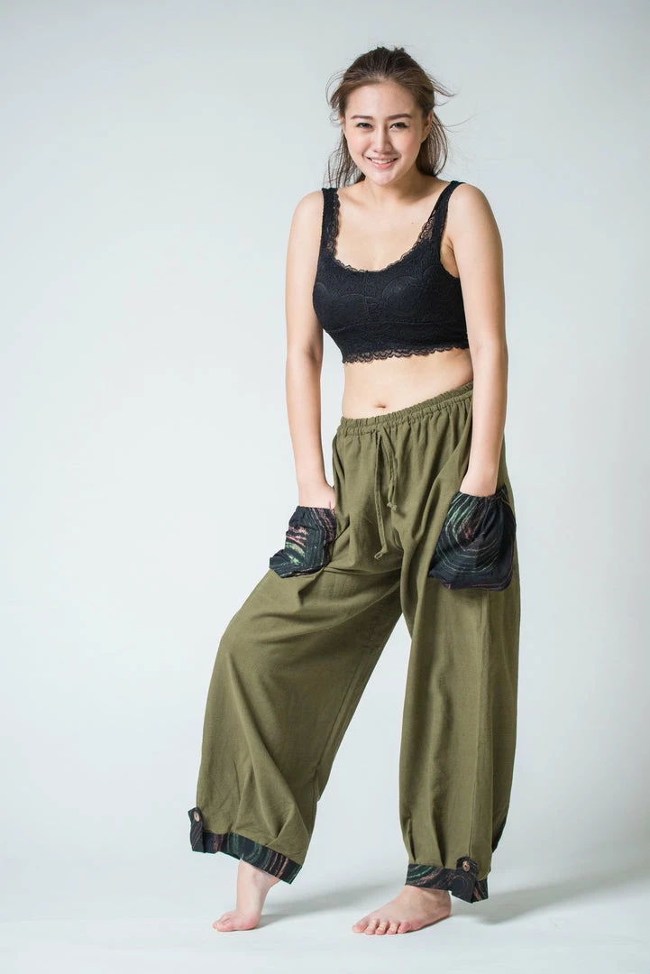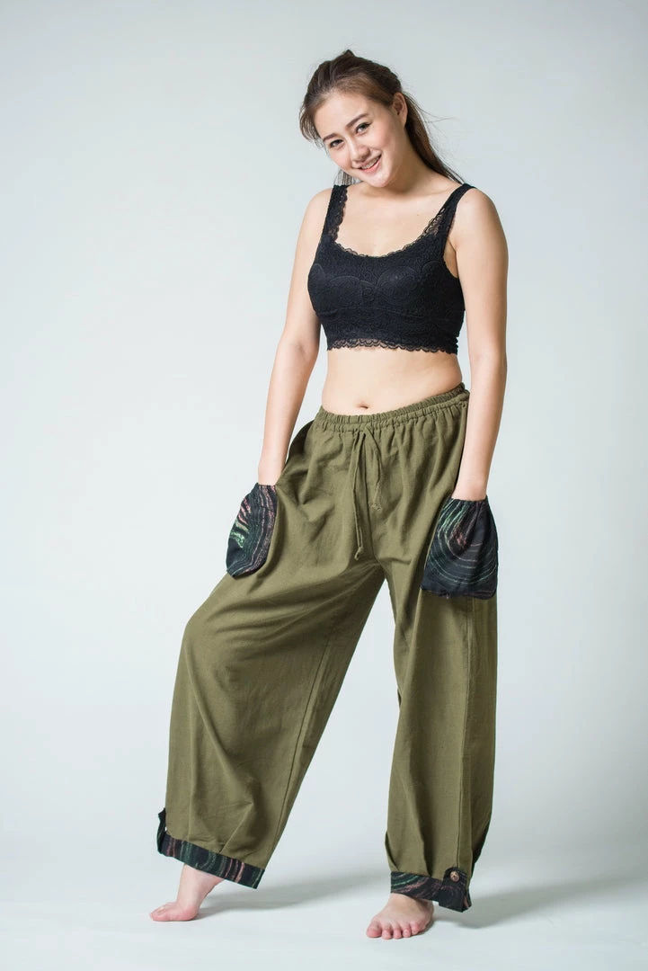 Thai Cotton Drawstring Pants With Hill Tribe Trim Ankles and Pockets