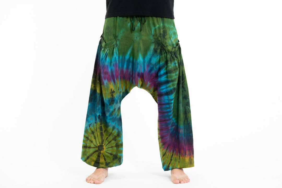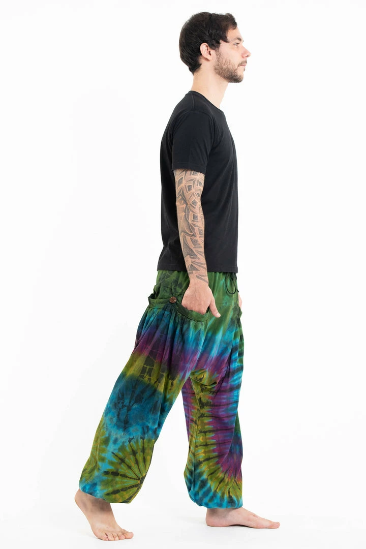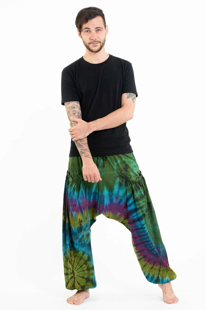 Loose-fit knitted cotton Tie Dye harem pants featuring elastic waist and ankle cuffs.