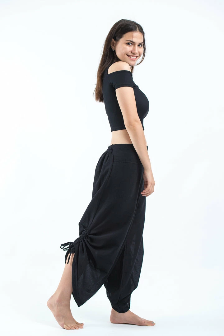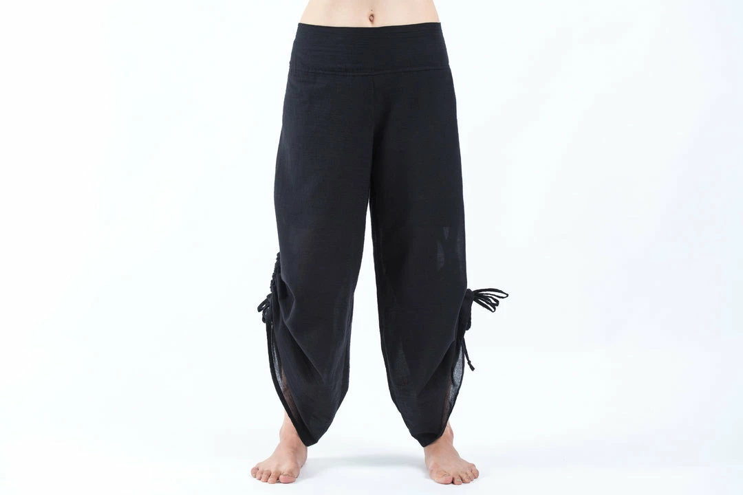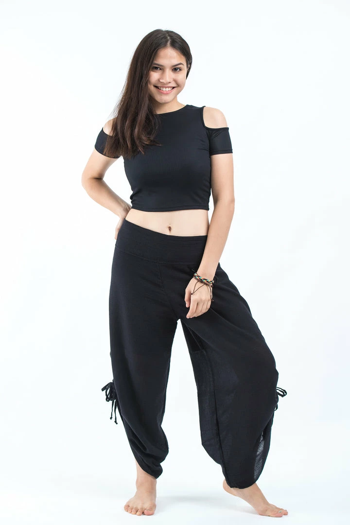 Soft breathable cotton wide-leg palazzo style harem pants with side adjustable drawstrings.