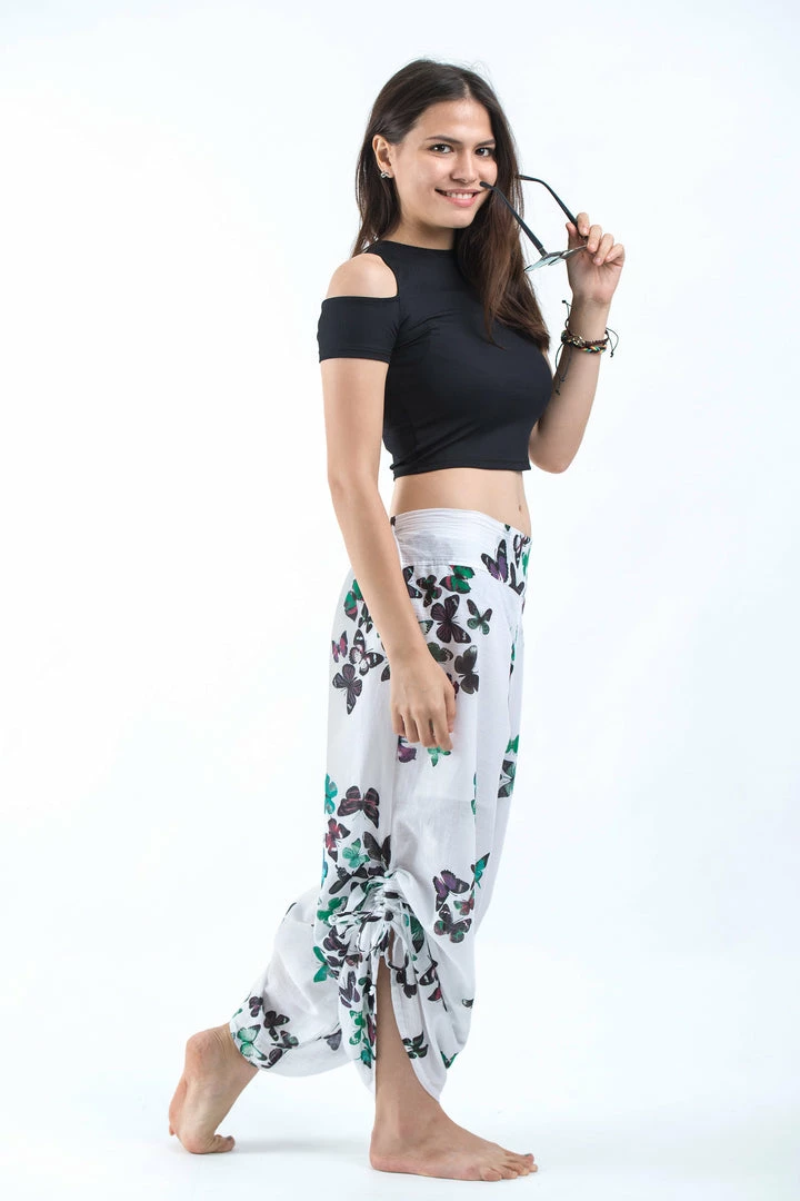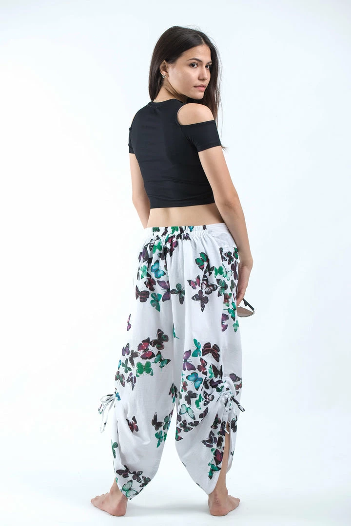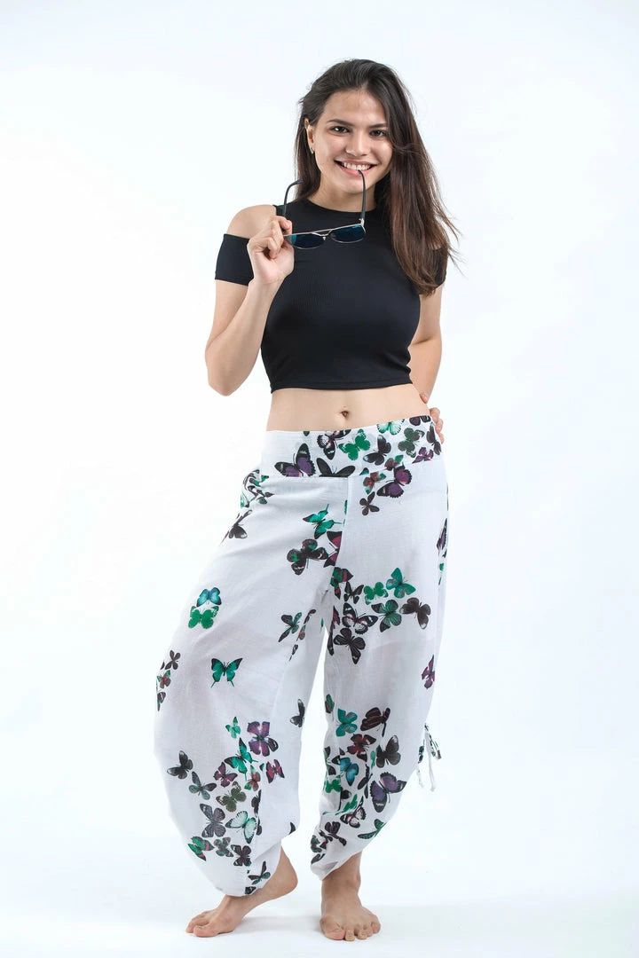 Soft breathable cotton wide-leg palazzo style harem pants with side adjustable drawstrings.